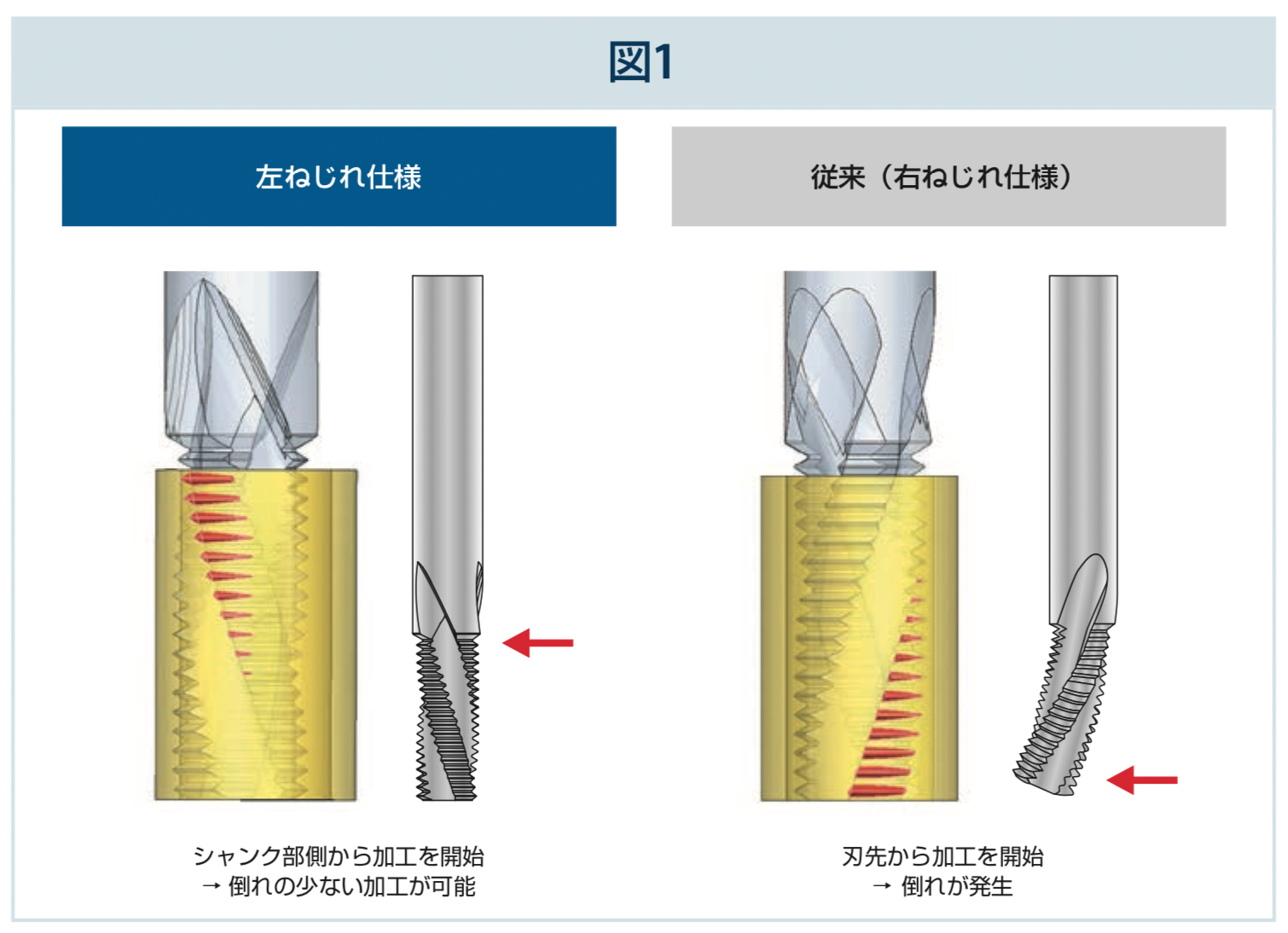 特許を取得した技術の1 つは、AT-1の左ねじれ仕様です。図1に示すように、従来の右ねじれ仕様のスレッドミルの場合、刃先から加工を開始するため、倒れが極めて生じやすくなっています。これに対し、AT-1 の右切削および左ねじれ仕様では、シャンク部側から加工を開始するため、倒れを最小限に抑えることができます。