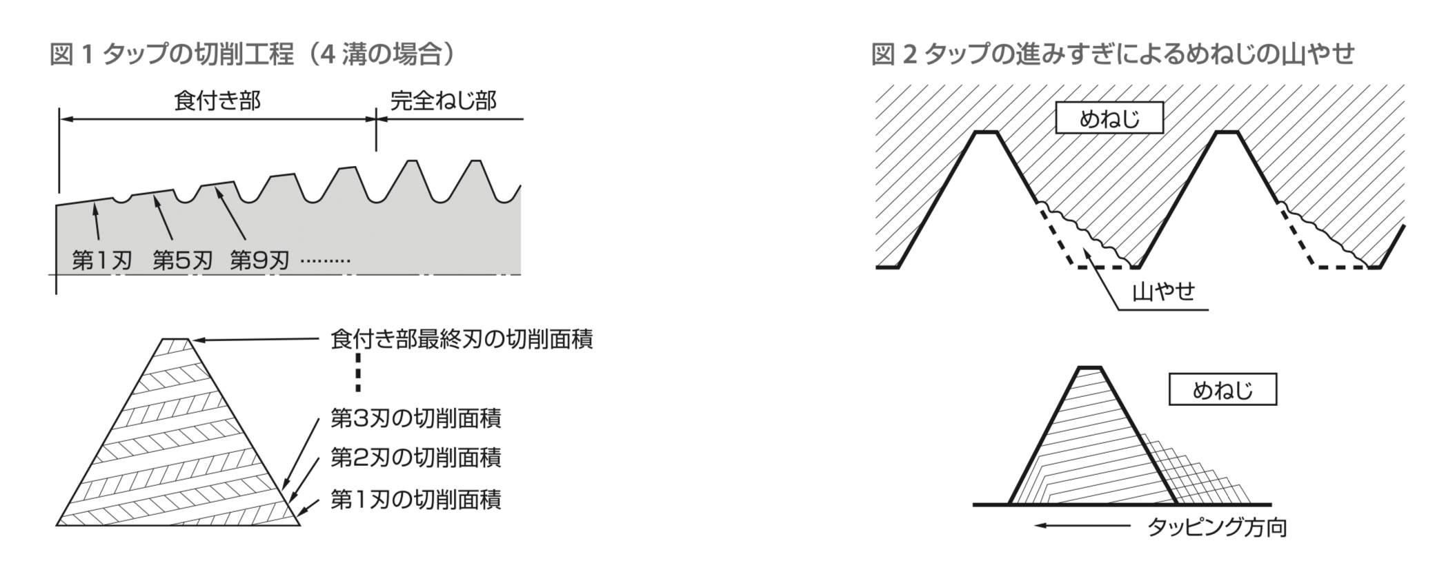 要因の一つは、1 回転当たりの送りが固定される点です。タップによるめねじ加工は、食付き部の、らせん状に並んだ切れ刃によって行われます。完全ねじ部は、原則として切削は行わず、すでに完成されたねじ山とかみ合ってタップ自身を案内する役目、いわゆる自進作用をしているに過ぎません。食付き部の各切れ刃は、タップの回転につれて分担して切削を行い、食付き部全体で完全なねじ山を形成します。