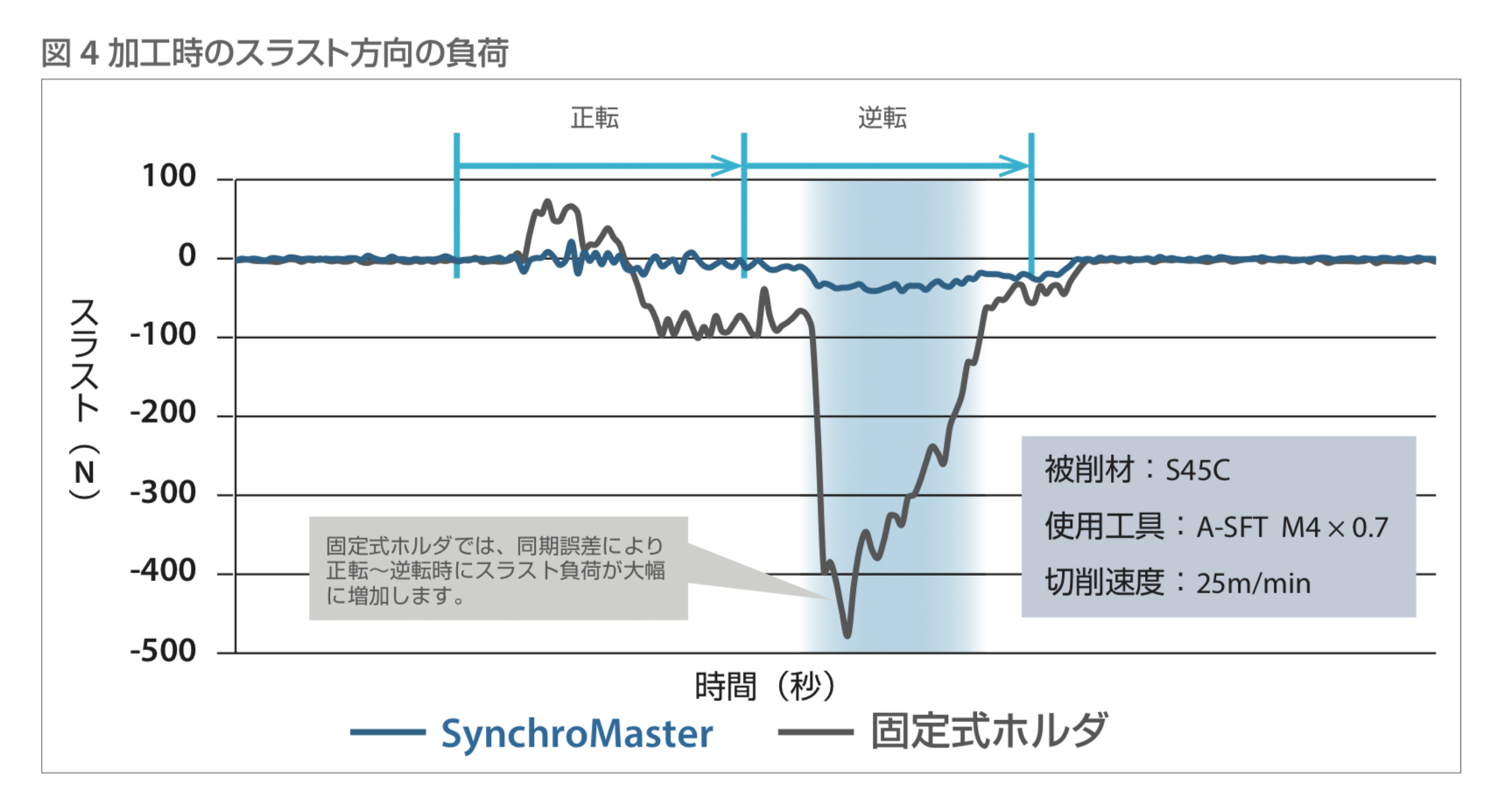 SynchroMaster は、タップホルダが微小にフロートすることで工具に生じる負荷を軽減させる機構(ダンパ)を有しています。図4 に示すように、タップ食付き時や逆転開始時に発生するスラスト方向の負荷を独自の一体構造ダンパが吸収します。加工負荷の吸収特性は、A-TAP に対して最適なチューニングをしており、相性抜群です。工具とホルダの最適な組み合わせが、タップの性能を引き出し、より安定した加工を実現します。