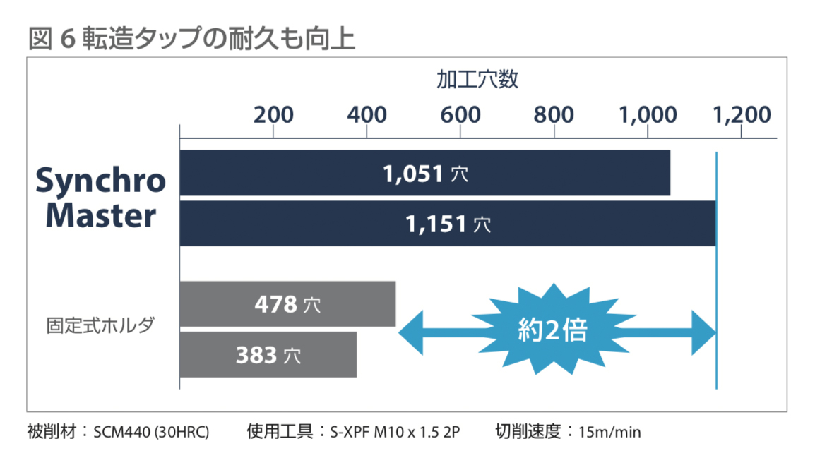 また、SyncroMasterは切削タップのみならず転造タップに対しても有効です。転造タップS-XPF を用いてSCM440を加工した事例を図6 に示します。固定式ホルダでは400穴程度で工具損傷が大きくなり、耐久と判断されていたものが、1000 穴程度加工できるようになりました。転造タップは切削を行わず、被削材の塑性変形を利用してめねじ加工する為、加工負荷が切削タップよりも大きくなります。加工負荷の一部をSyncroMaster が吸収する効果は、転造タップに対しても有効です。