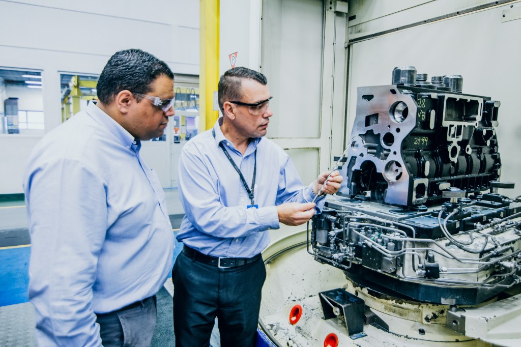 左から、MWM社のプロセスエンジニア、タルチシオ・ボッタチーニ氏、オーエスジーの販売技術者ヴァルディル・リマ。ブラジルのサンパウロにあるMWM社の工場で写真向けにポーズをとっているところ。