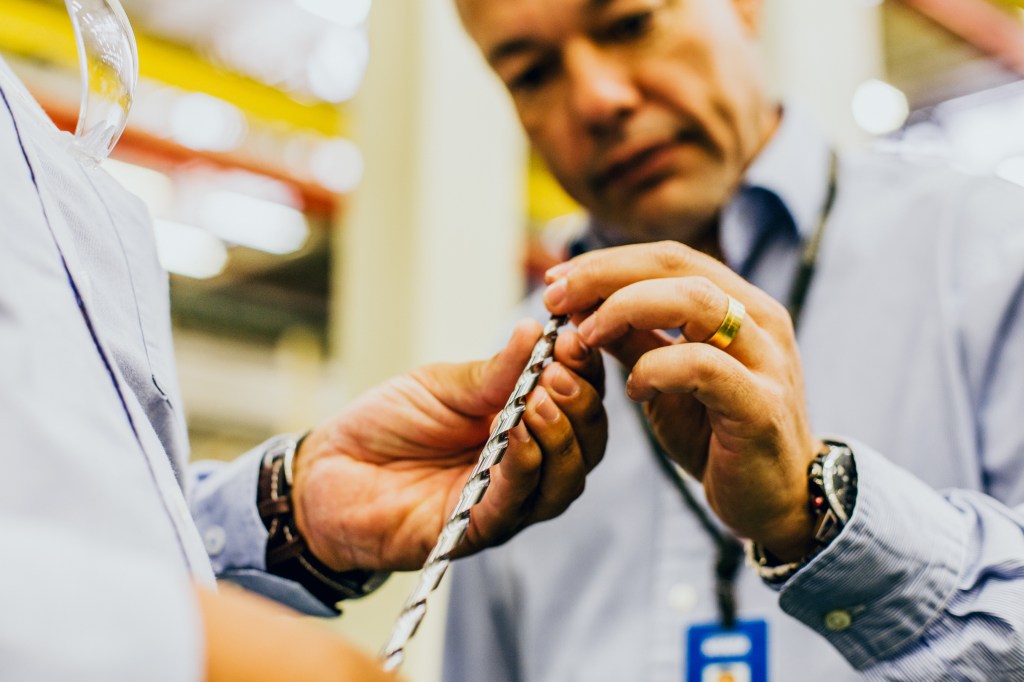 左から、オーエスジーの販売技術者、ヴァルディル・リマ、MWM社のプロセスエンジニア、タルチシオ・ボッタチーニ氏。直径8 mmの油穴付き超硬ドリルADO 30Dをカメラに見せているところ。