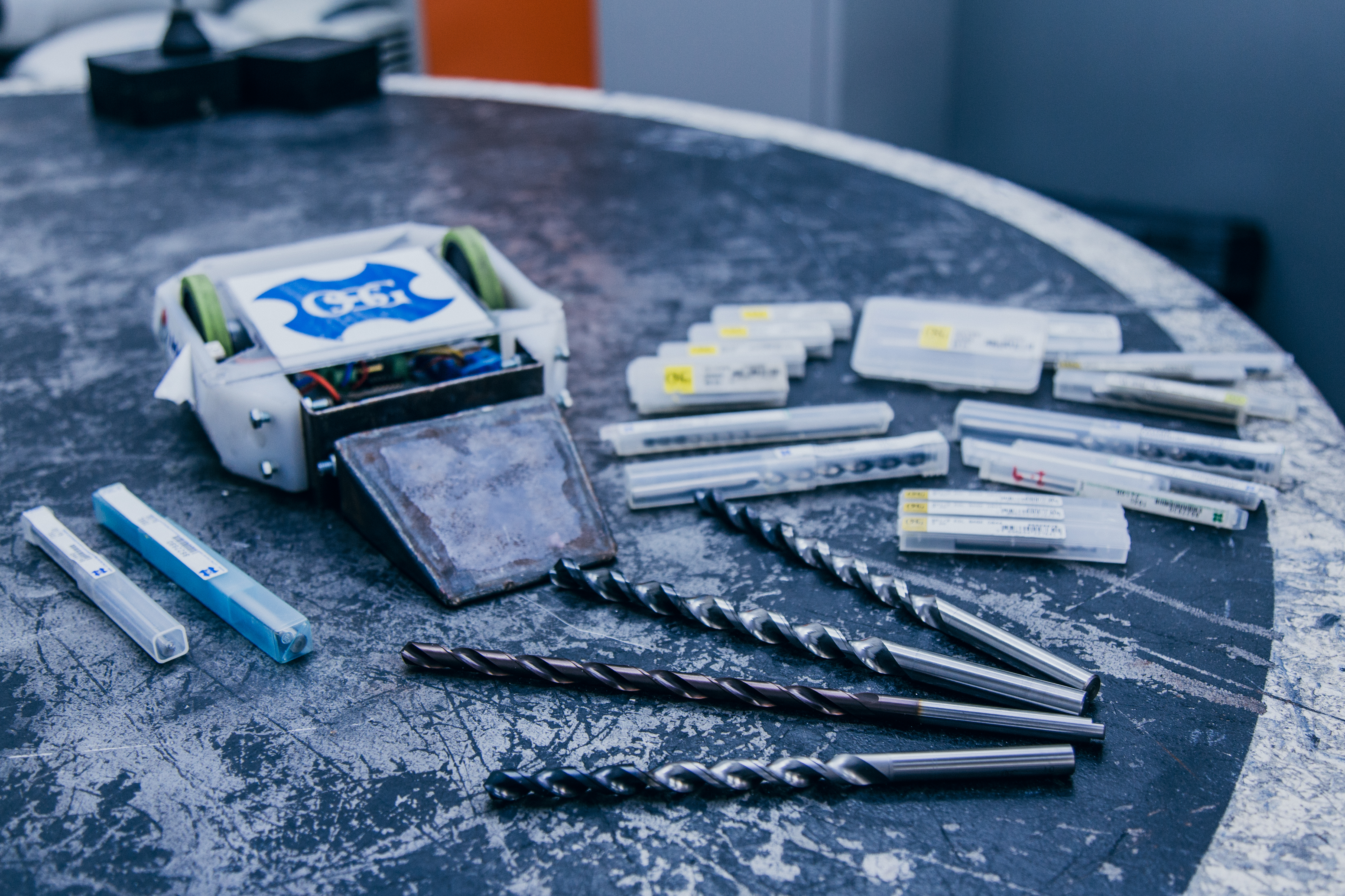 最もよく使われているオーエスジーの工具:オーエスジーの多くのドリル、エンドミル、タップが、ThundeRatzチームの戦闘ロボットの製作に使われています。丸ダイスも頻度は少なめですが使われています。
