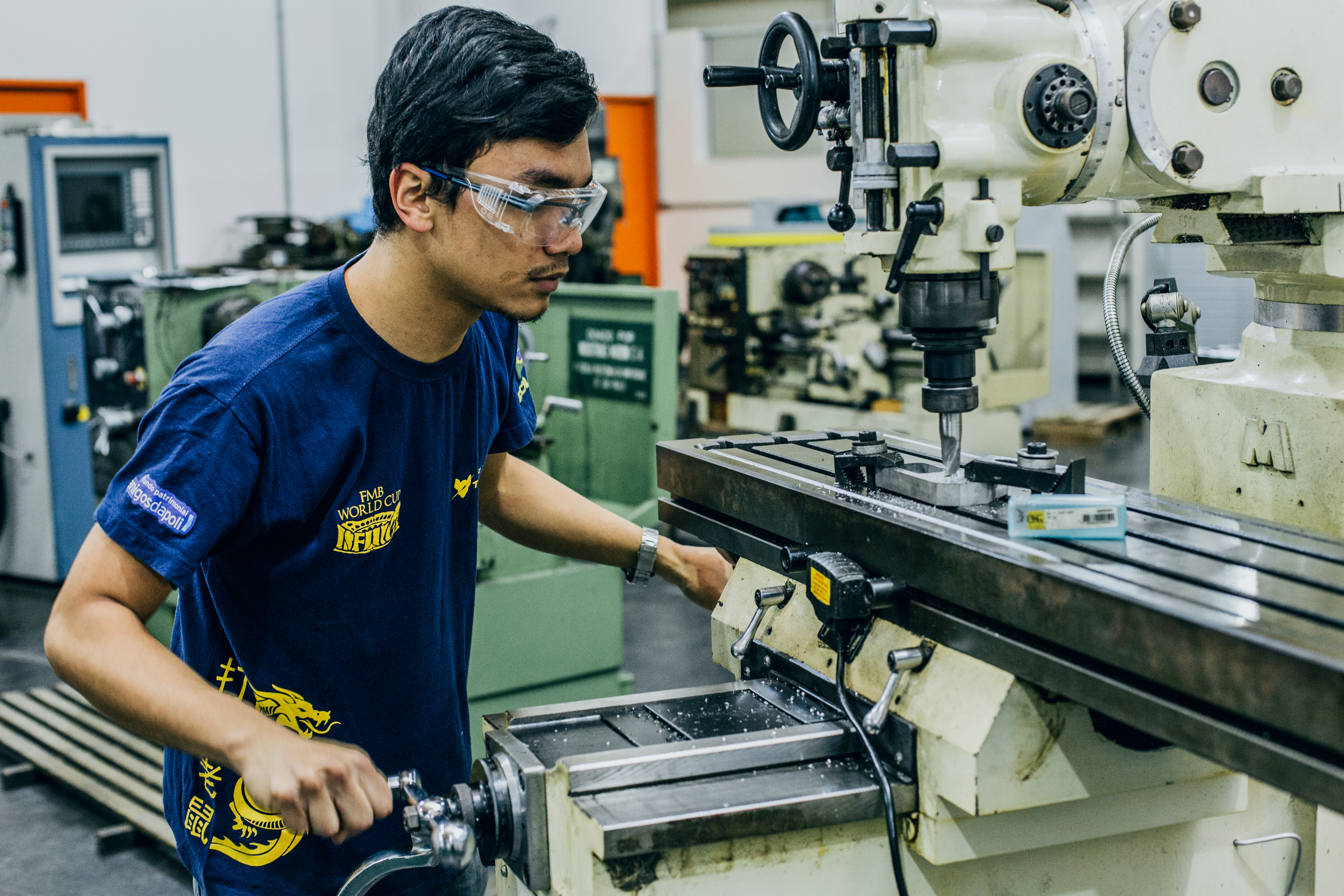 戦闘ロボットの武器の加工にオーエスジーのエンドミルを使用する、ThundeRatz のメンバーで機械工学専攻Matheus Ivanagaさん。