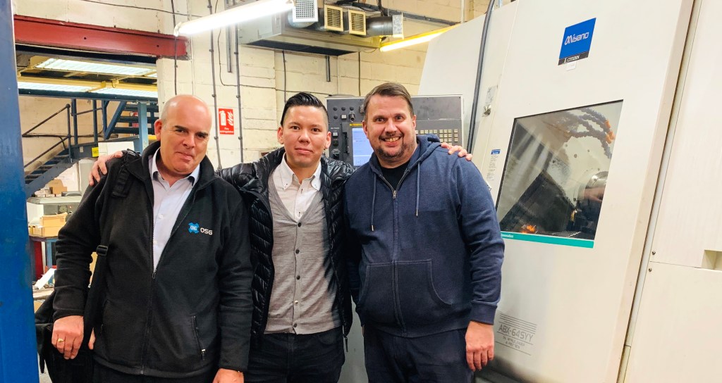 (左から)OSG UKのエリアマネージャー、Neil Lane氏、OSG UKのエンジニアリングマネージャーのクボ・ヒロズミ氏、Clarkwood Engineering社の主任CNCプログラマーのSteven Hall氏(英国、ウルヴァーハンプトンに所在するClarkwood Engineering社の製造施設にて撮影)