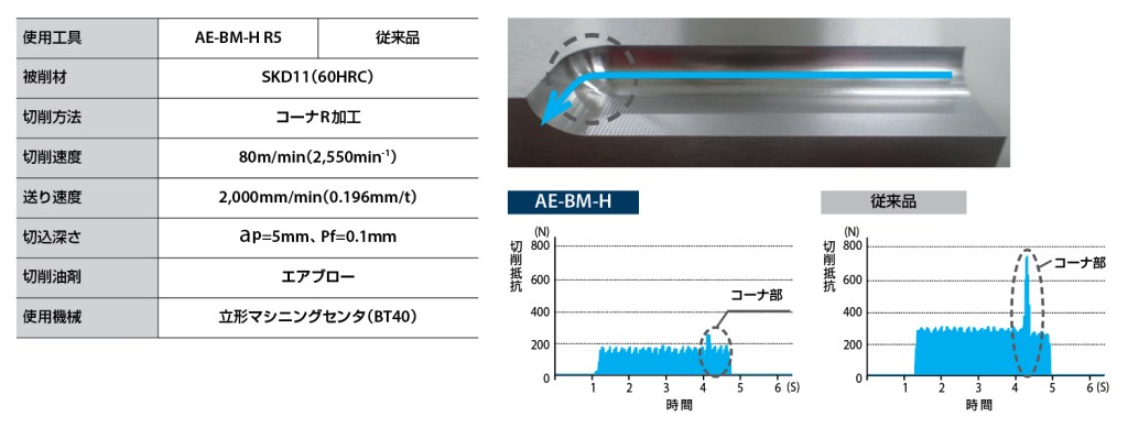 AE-BM-Hは、高硬度鋼の高能率かつ安定加工をコンセプトに開発した製品で、鍛造金型、プレス金型、ダイカスト金型が主なターゲットとなります。ボール刃のスパイラルカーブを従来同等品に対し強くねじることで切削抵抗を低減しました。また不等分割刃を採用することで振動の周期性により増幅される自励振動を抑制し、高硬度鋼加工時に発生しやすいびびり振動を抑制しています。図2は切削抵抗の比較データです。試験ワークの直角コーナ部分では、接触する切れ刃数が増加するため、従来製品は切削抵抗の増加が顕著なのに対し、AE-BM-Hではわずかな切削抵抗の増加に留まっています。