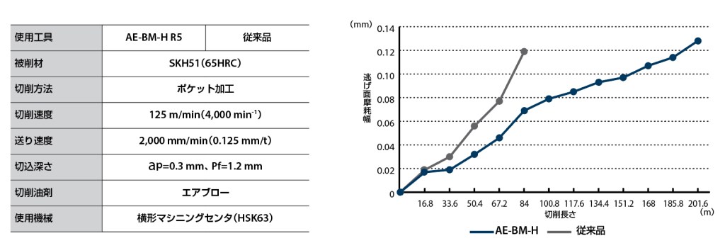 図6は高硬度鋼SKD11(60HRC)の耐久試験データです。AE-BD-Hは他社と比較しても優れた耐久性を実現しています。