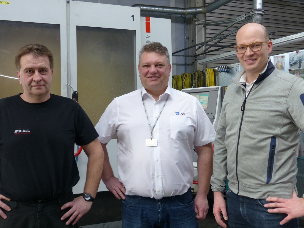 (左から右へ)Stickel GmbH社の生産管理者Thomas Birkenmaier氏、OSG GmbHの技術・営業担当者Sven Clement、Stickel GmbH社のMatthias Stickel氏(ドイツ、レヒガウに所在するStickel GmbH社の製造拠点にて)