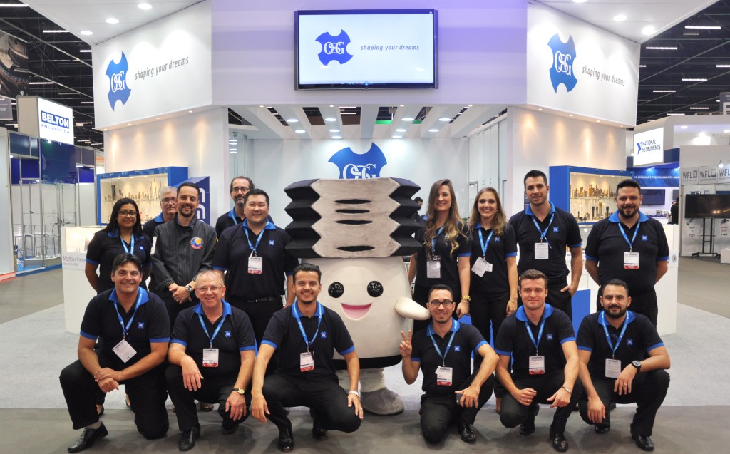 ブラジル現地法人OSG Sulamericanaの従業員との集合写真に写るタップくん。2017年5月のEXPOMAFEにて。EXPOMAFEは、世界トップの製造機械、設備、技術のサプライヤーが、中南米の金属加工業界における最も重要なバイヤーと接触の機会を得ることができる、ブラジル有数の展示会です。