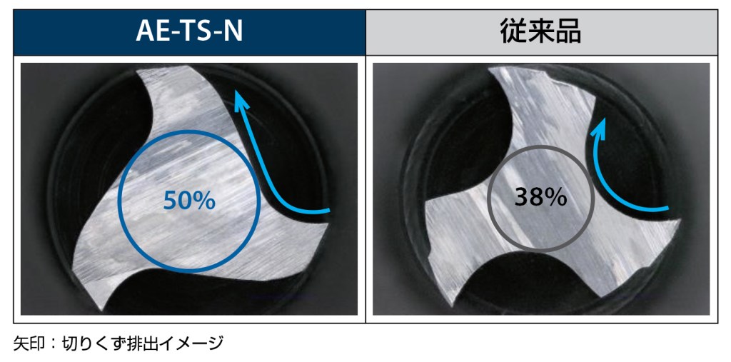今回そのような常識を打ち破るべく開発したAE-TS-NとAE-TL-Nは、スタンダードタイプと称しながらも3枚刃且つDLCコーティングが施されており、非鉄金属加工において最も適したスペックを有しています。