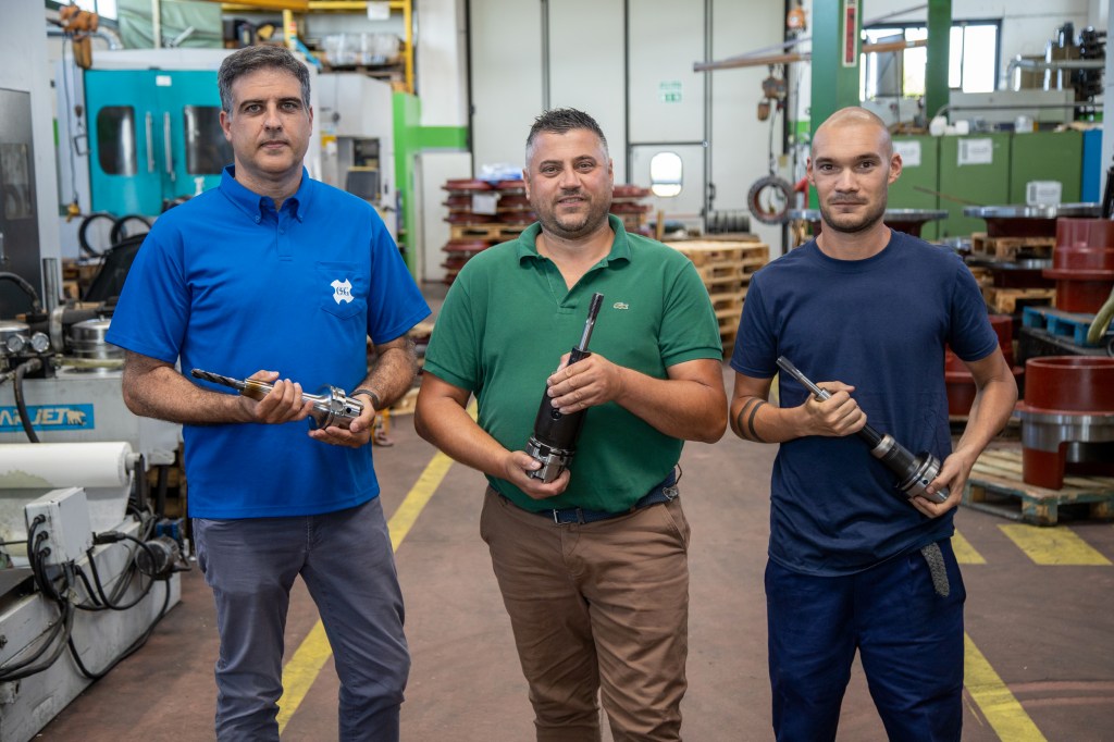 左から、OSG ItaliaセールスエンジニアリングおよびマーケティングマネージャーのAndreaSeveri、MPC社オーナーのStefano Soldati、MPC社マシンオペレーターのLucaが、イタリアのエミリアロマーニャ州サンジョルジョディチェセナにあるMPC社施設内。