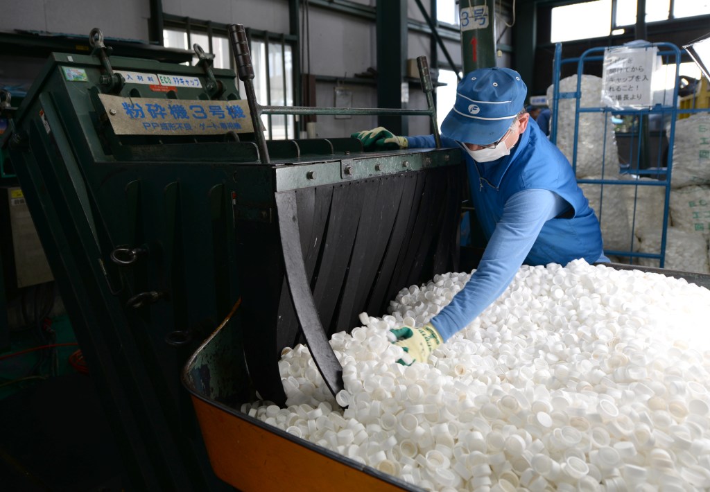 使用済みペットボトルキャップを粉砕機に投入するフジイ化工株式会社のスタッフ。