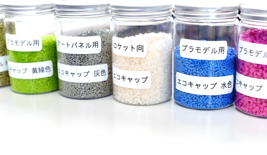 アンジョウハーツプロジェクトの代表的な取り組みのひとつに、企業のノベルティグッズとしてペットボトルキャップをオリジナルのプラスチックモデルキットに再生する取り組みがあります。このプラスチックモデルの素材には、使用済みペットボトルキャップ(ポリプロピレン製)が使用されます。