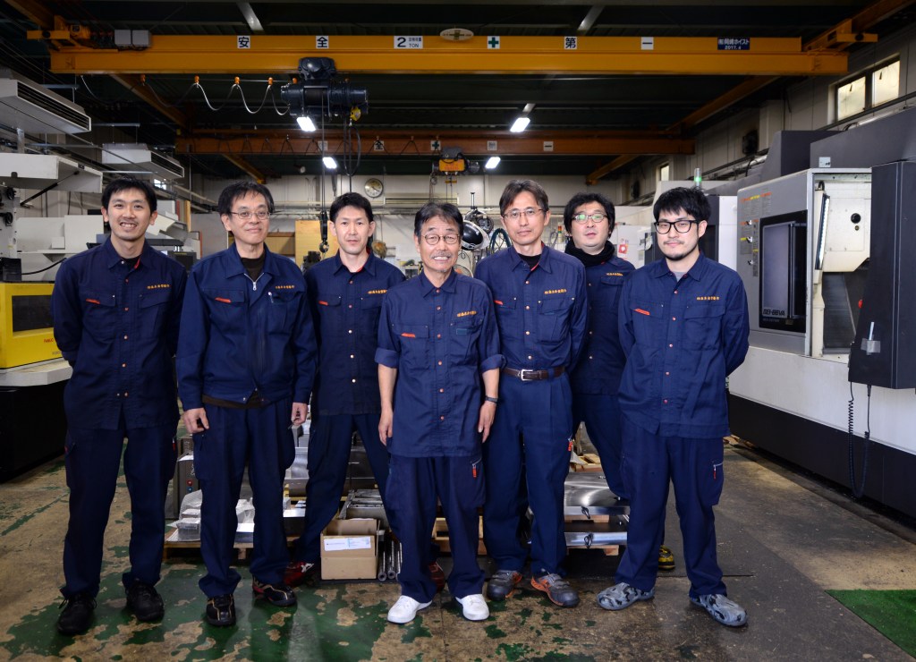 (左から)石川雄一氏、越取由克氏、早川剛弘氏、髙木雅英氏(代表取締役社長)、祢宜田伸夫氏、野呂瀬健太郎氏、髙木英樹氏(製造エンジニア)(愛知県安城市に所在する有限会社髙木金型製作の生産工場にて)