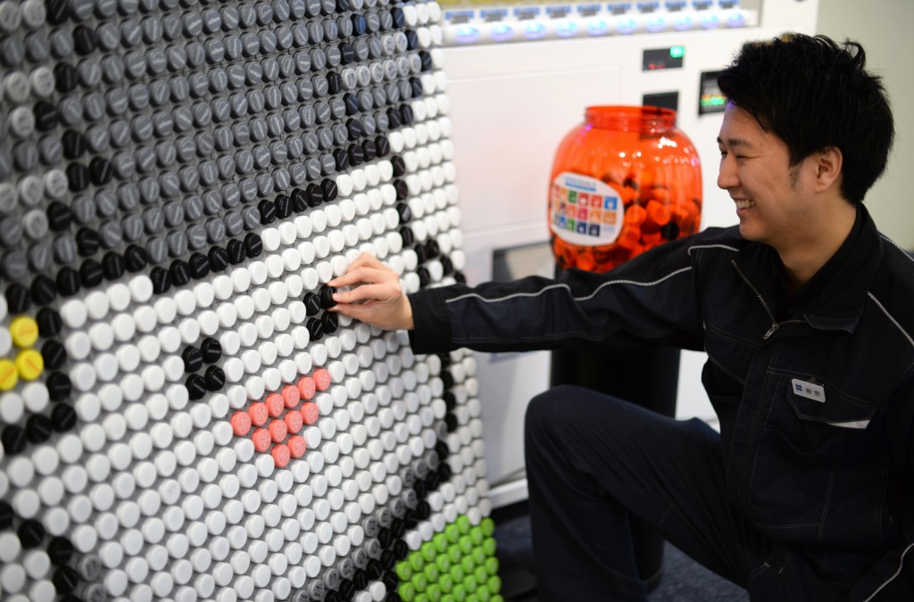 (左から)オーエスジーの「A Brand」ロゴ、および公式キャラクター「タップくん」のキャップアート。アンジョウハーツプロジェクトでは、使用済みペットボトルキャップを単にリサイクルするのではなく、環境問題に関するコミュニケーションを促進するキャップアートにも取り組んでいます。