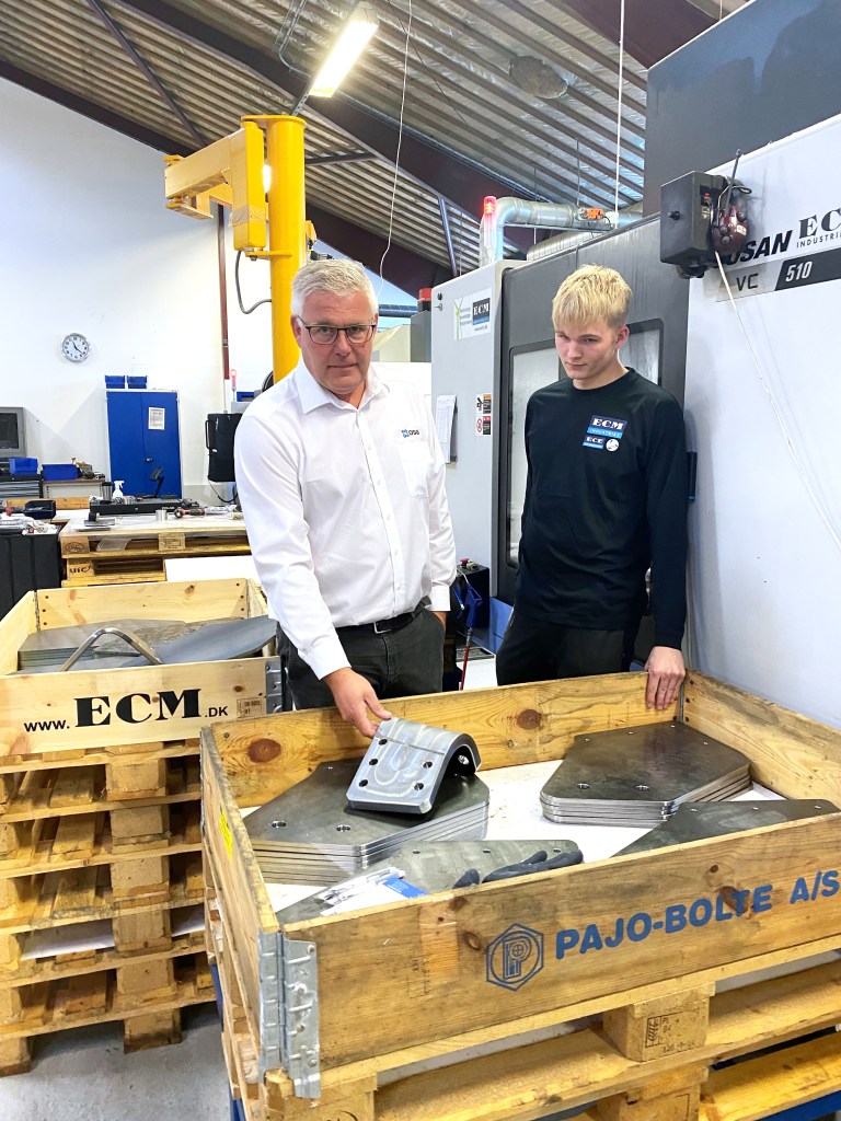 右から ECM Industries 社の研修生 Asker Jaedicke Christiansen と、OSG Scandinaviaのセールスエンジニア Morten Larsen。デンマーク エグトベドの ECM Industries 社 生産工場にて写真撮影が行われました。
