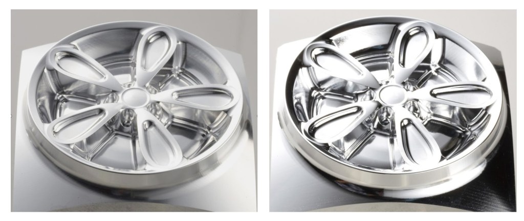アルミニウム合金のワーク比較。左側がPCD工具で加工したワーク(加工面粗さRa 300n)、右側が日新ダイヤモンドの人工単結晶ダイヤモンドで加工したワーク(加工面粗さRa 50n)。人工単結晶ダイヤモンドによる加工ワークの表面粗さは、PCD工具の6倍以上。日新ダイヤモンドの人工単結晶ダイヤモンド切削工具は、透明度の高い樹脂加工や光学部品、自動車関連部品の精密加工など、安定した品質と長い工具寿命を必要とする加工に威力を発揮します。