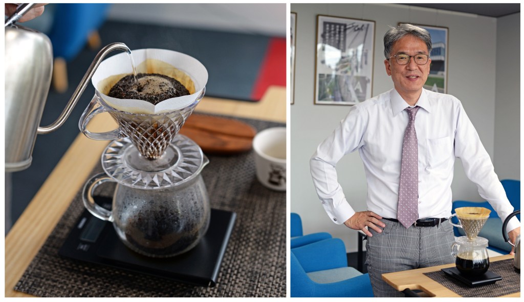 オフィスで来客にコーヒーを淹れる社長の押野。