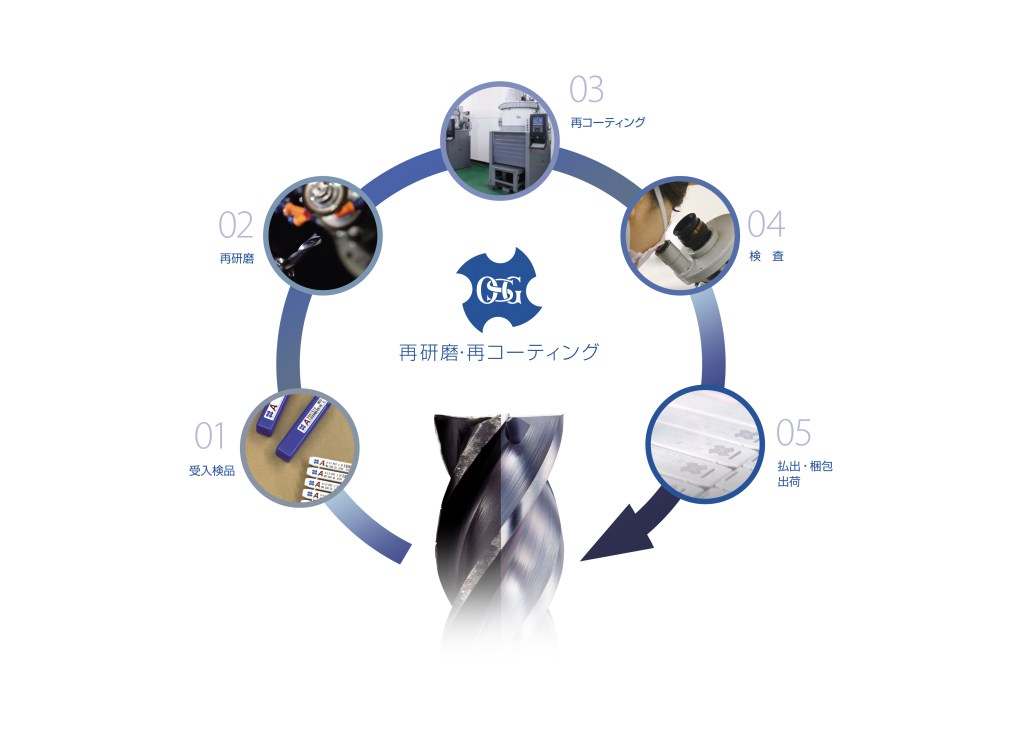 オーエスジーは、総合切削工具メーカとして、超硬工具、ハイス工具、PCD工具、転造ダイス、特殊品など、さまざまな製品の再研磨と再コーティングに対応します。当社が提供するこれらのサービスは、使用済みの工具を新品同等性能に蘇らせます。再研磨・再コーティング部門は、すべての工程でオーエスジー独自の製造図面を使用します。また、オーエスジーグループ各社は、品質管理マニュアルを遵守し、検査工程では製造部門が使用するものと同じ検査機器を使用します。世界14カ国に再研磨・再コーティングに対応する工場を持ち、世界中のお客様のニーズにお応えしています。