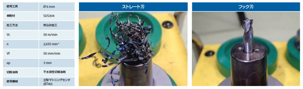 次に、実際にストレート刃の従来品とフック形状のAE-VTSSで連続した突込み加工を行い、切りくずの巻き付き具合を比較しました。図4は37穴加工時の工具写真です。従来のストレート刃は切りくずの巻き付きが発生しましたが、フック形状のAE-VTSSは切りくずトラブルがなく連続した加工が可能でした。切りくずの巻き付き、噛み込みを抑制することで、安定した連続加工が可能となります。