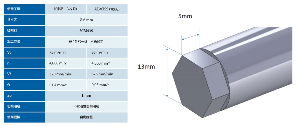 図 5. 従来2枚刃エンドミルと3枚刃AE-VTSSの加工データと加工ワークイメージ