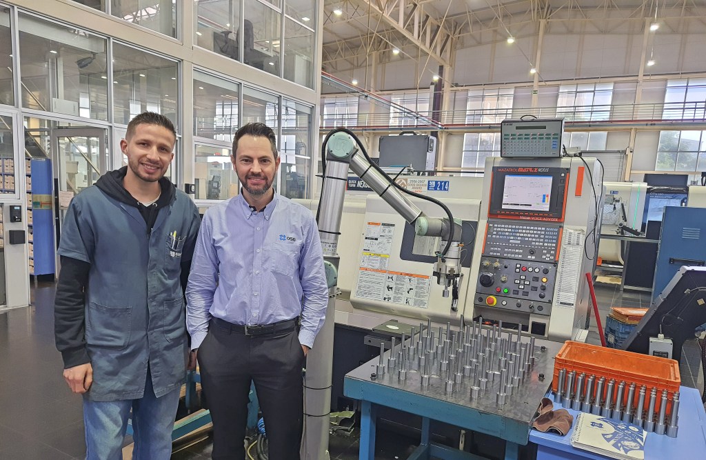 ブラジル南部のリオグランデ・ド・スル州カシアス・ド・スル市に位置 する Aço Peças Demore 社の工場にて。左から Aço Peças Demore 社のプロセスアナリストBruno Simon 氏とOSG Sulamericana 営業技術のAnderson Scalginsky。
