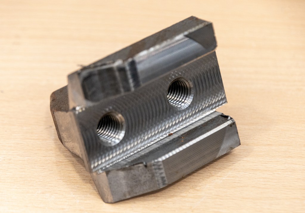 近年、Olimac社はコーンヘッド用のC40(JIS S40C)製の固定ブラケットコード製造において、工具性能の向上を検討していました。同社は2015年から、様々な形状のブラケットコードを製造してきました。この部品の現在の年間生産量は約25,000個です。各ブラケットコードには、2か所のねじ加工があり、ねじサイズはM14×2、ねじ立て長さは36mmです。穴深さ39mmの下穴加工には超硬ドリルφ12が使用され、マザックHCN-5000横形マシニングセンタを用いて加工されます。