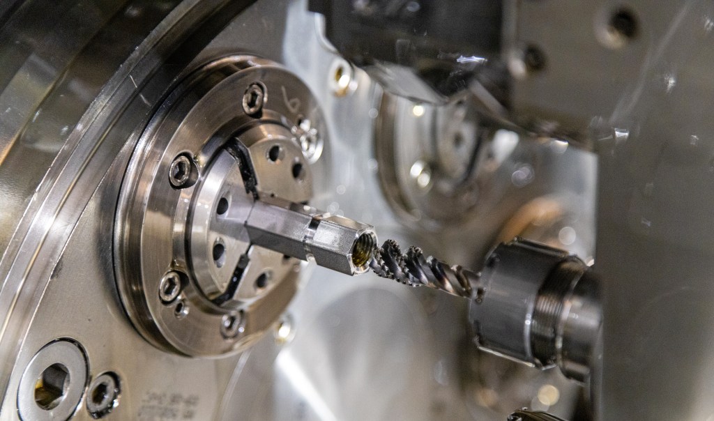 最近Guerrini社は、自動車分野向けに開発された特殊クランプナット製造において、安定した切りくず処理と工具寿命の向上を目指していました。生産能力は、2020年の統計に基づくと年間約150万個と推定され、ロットサイズは平均8万~12万個です。AISI430Nb (フェライト系) ステンレス鋼製クランプナットには、M12×1.5 ねじ立て長さ10.4mm(止り)を1か所加工する必要があります。 下穴径は10.6 mm です。加工にはINDEX社製 MS32 CNC多軸加工機を使用します。