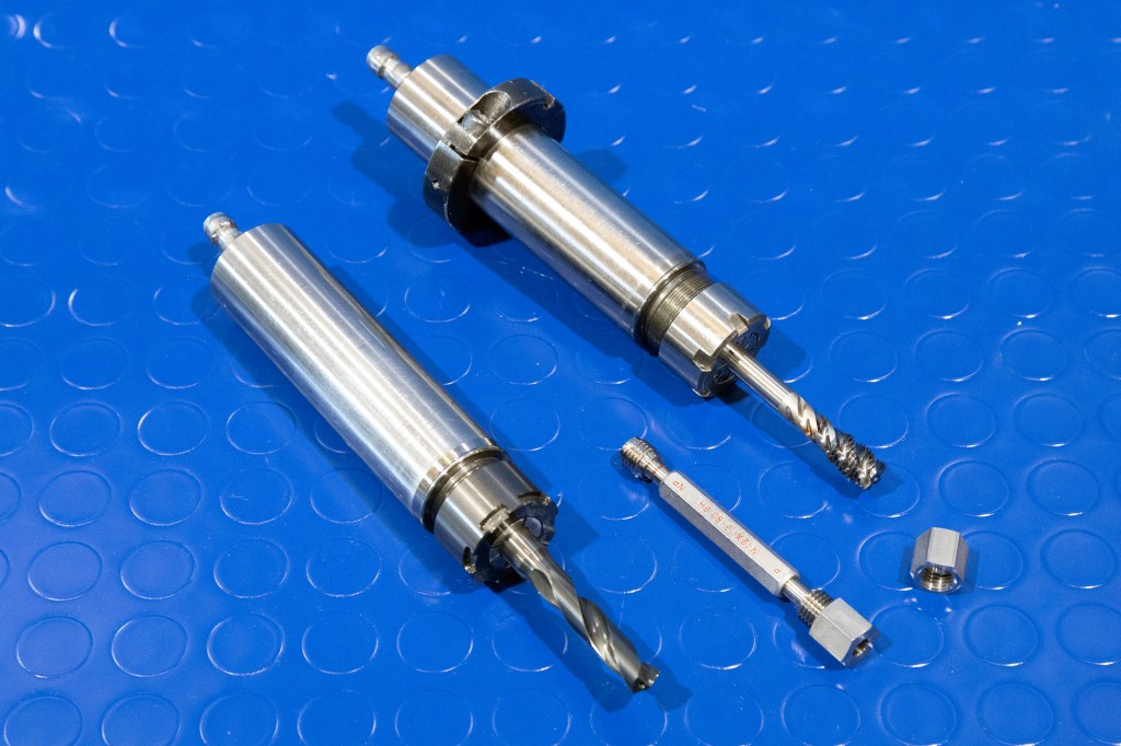 連絡を受けてすぐに、OSG Italiaエンジニアリング マネージャーのAndrea Severiと営業担当者の Alfredo Nadini が、加工状況を確認するためにGuerrini社の工場を訪問しました。切削状況を分析した結果、ドリルはADO-SUS-3D直径 10.6 mm (EDP# 8681060) 、タップはスパイラルタップZ-SFT M12x1.5 (EDP# 48029176) の2つを提案しました。 どちらの工具もER25コレットホルダでスピンドルに取り付けられます。使用される切削油剤は油性です。