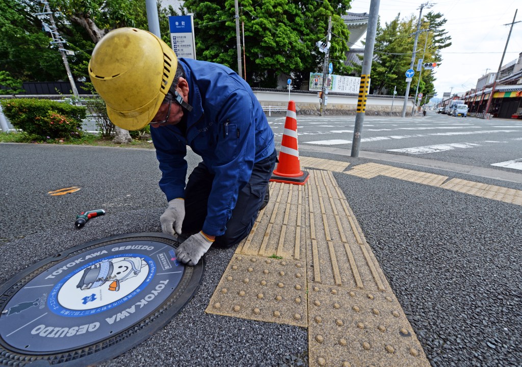 新しいデザインマンホール蓋を設置する様子。