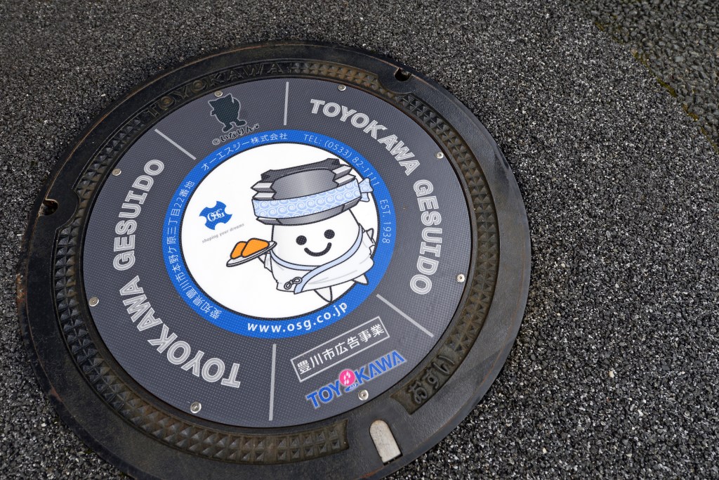 リニューアルされたデザインマンホール蓋。弊社の公式マスコットキャラクター「タップくん」と豊川名物の「稲荷寿司」がモチーフです。