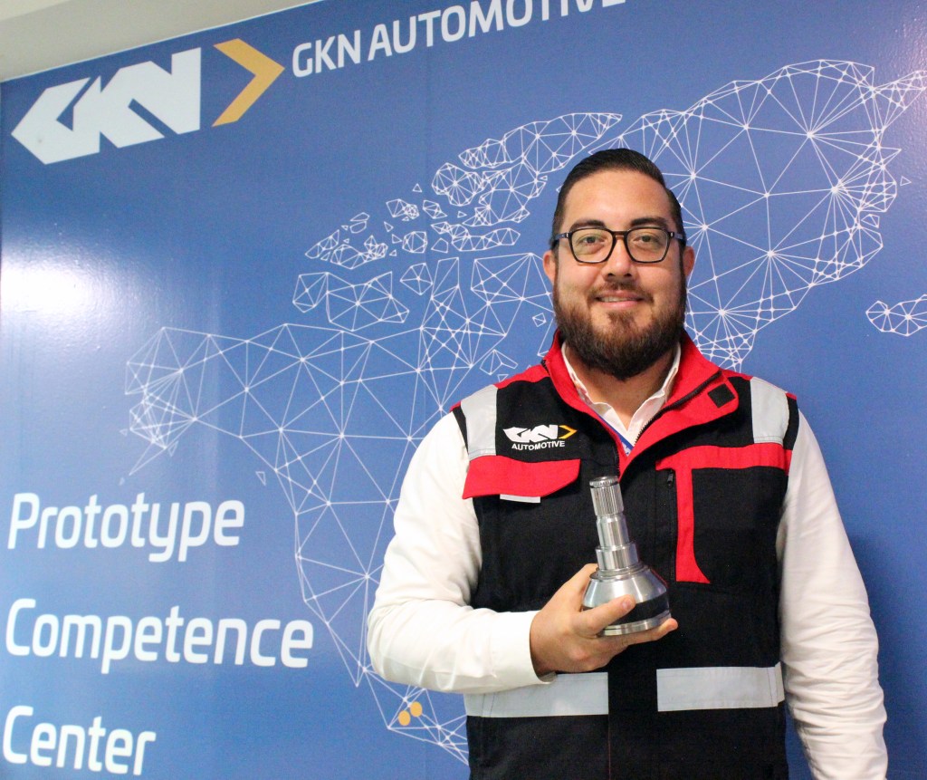 CVジョイントを手に持つGKN社試作マネージャーRicardo González氏。メキシコのグアナファト州セラヤにあるGKN社製造工場にて。