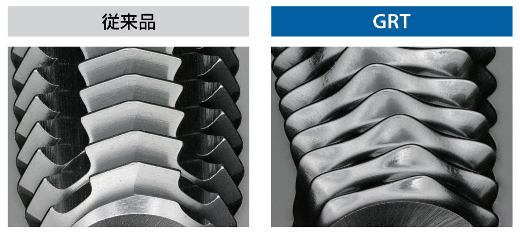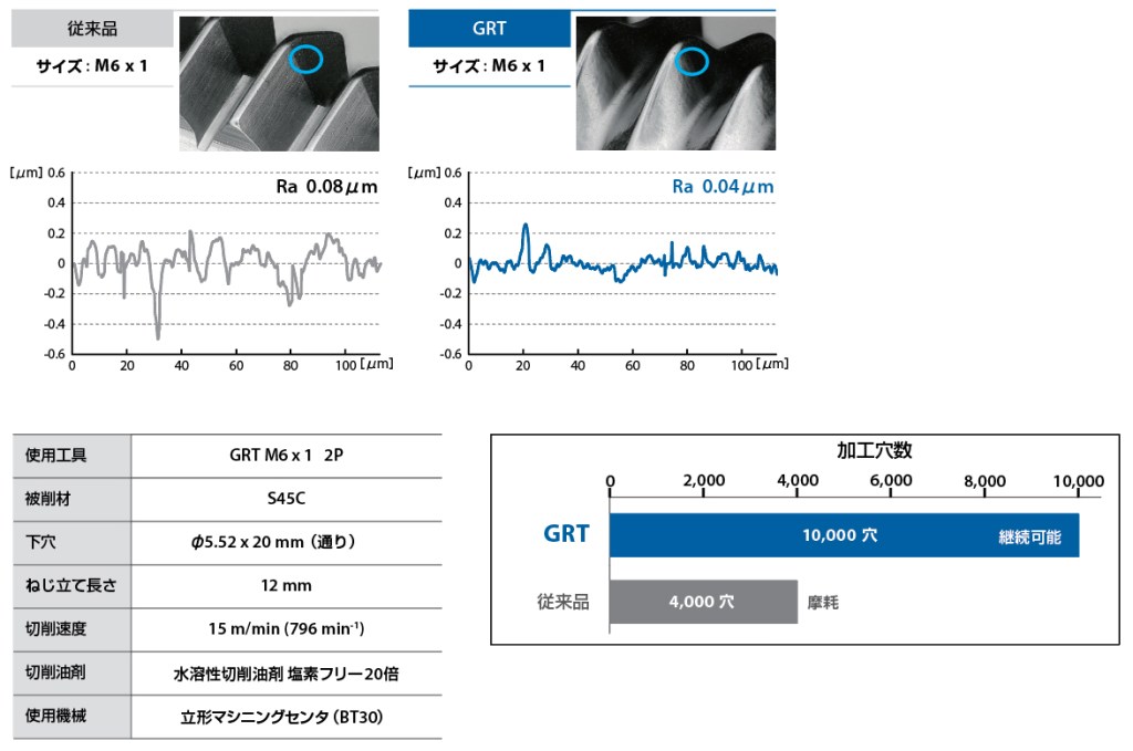 工具製造方法の改良により、GRTのねじ部の面粗さが大幅に改善されています(図5)。これにより摩擦熱が抑えられ、工具寿命の延長につながっています。