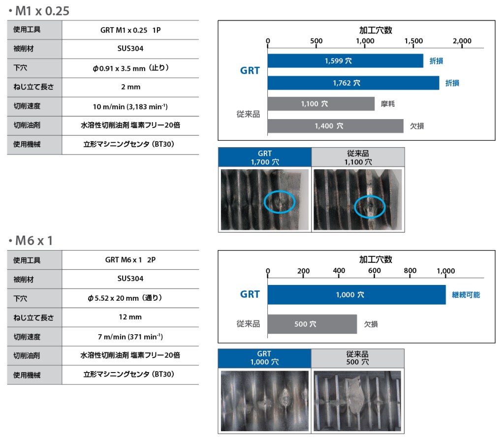 被削材SUS304、M1×0.25とM6×1の加工試験結果を示します(図8)。従来品に対して高い耐久性を実現しています。また、鋼やアルミニウム合金など、さまざまな被削材でも高い耐久性が得られます。