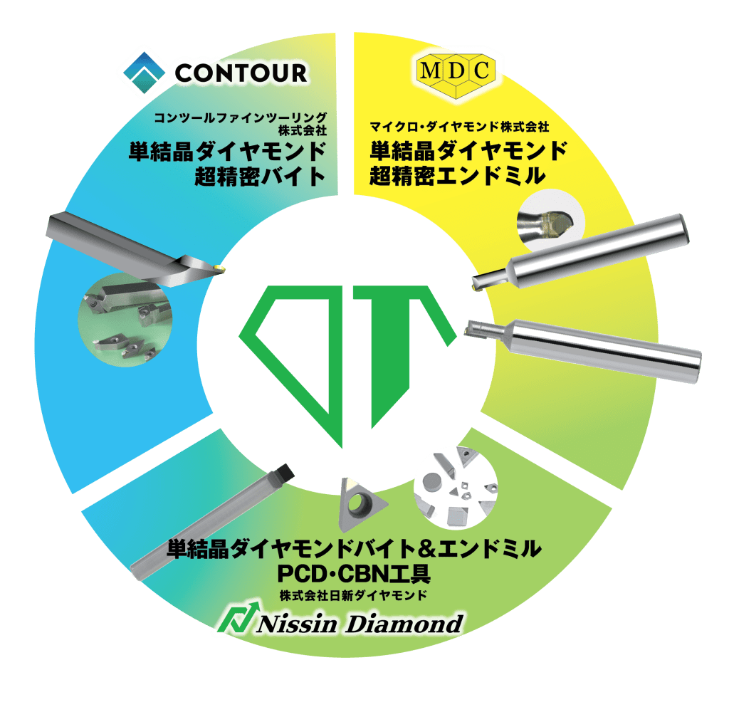 図1. オーエスジーダイヤモンドツール社は、Contour社、マイクロダイヤモンド社、および日新ダイヤモンド社の3社がそれぞれ独自の専門技術で荒加工から超微細精密加工まで幅広い加工ニーズに応える総合ダイヤモンド工具メーカです。高度な設計力を活かし、試作開発から量産までを効率的に対応しています。