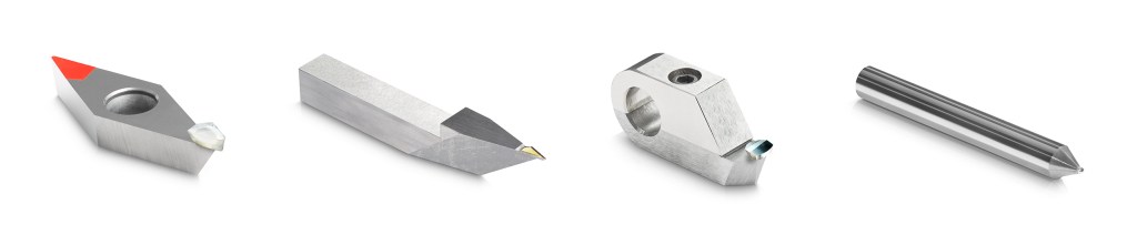 左から、Contour社の単結晶ダイヤモンドインサート、単結晶ダイヤモンドバイト、単結晶ダイヤモンドフライカットインサート、単結晶ダイヤモンドボールエンドミル。