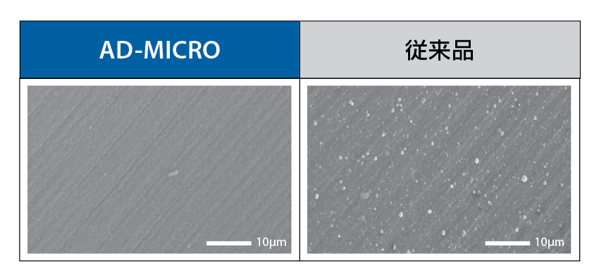 ドリルのコーティングは、耐摩耗性・耐熱性や表面潤滑性を向上させるうえで非常に重要です。AD-MICROは、小径加工に最適な最新コーティングであるKeptAコーティングを採用し、従来品から大幅な性能向上を実現しました。KeptAコーティングは、図2に示すように、非常に平滑な被膜表面で、超硬母材との密着性が高いコーティングです。この平滑な被膜により、切りくずをスムースに排出し、高い密着性により剥離が起きにくくなりました。耐摩耗性・耐熱性にも優れており、工具の長寿命化に貢献しています。
