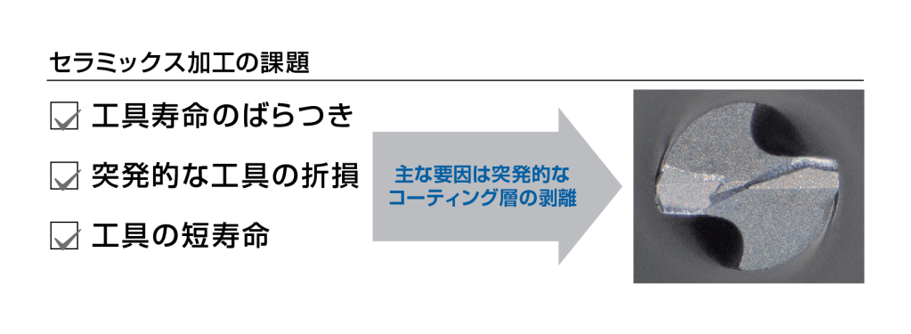 さらに、厚い心厚、弱ねじれ溝により、高硬度のセラミックスに対して、耐久性を高めた製品となっています。